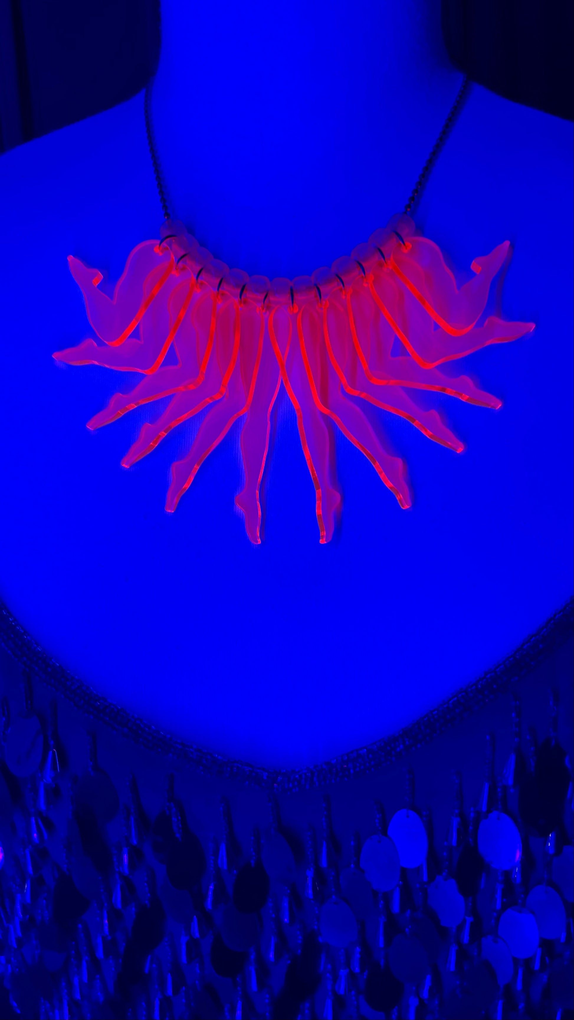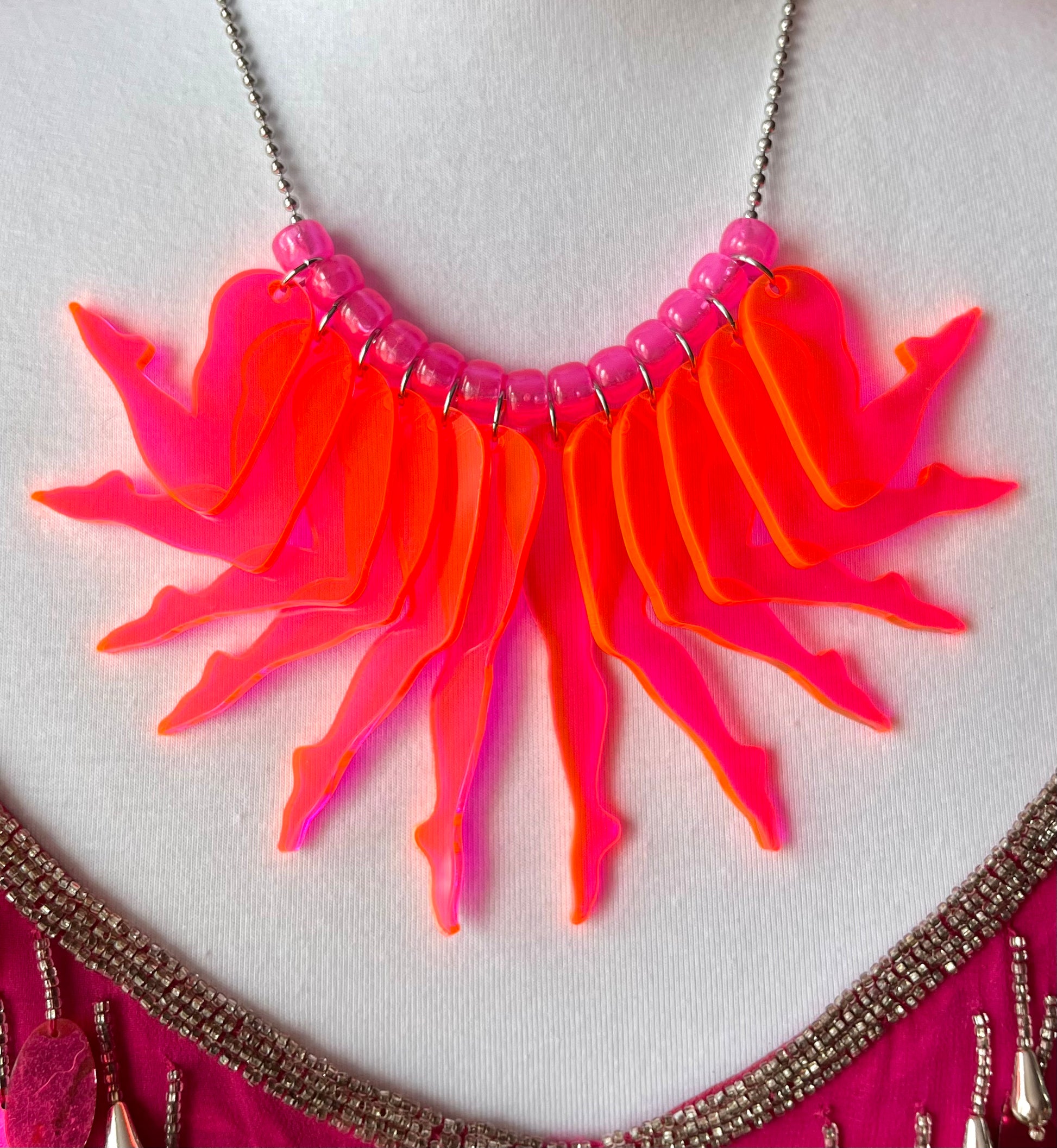 Twelve legs cut from translucent neon pink .125" / 3mm thick acrylic, with glow-in-the-dark acrylic spacer beads. The longest leg is 3in / 7.5cm.